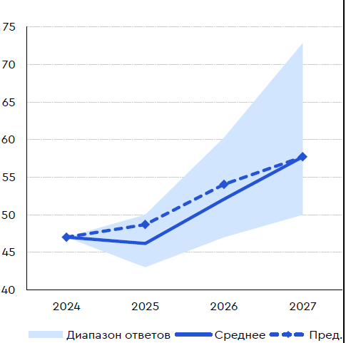 В консенсус-прогнозе отмечается, что в 2026 г. экспорт СПГ может вырасти до 52 млрд куб. м, а в 2027 г. он может достигнуть 58 млрд куб. м (+11,5% к уровню 2026 г.).